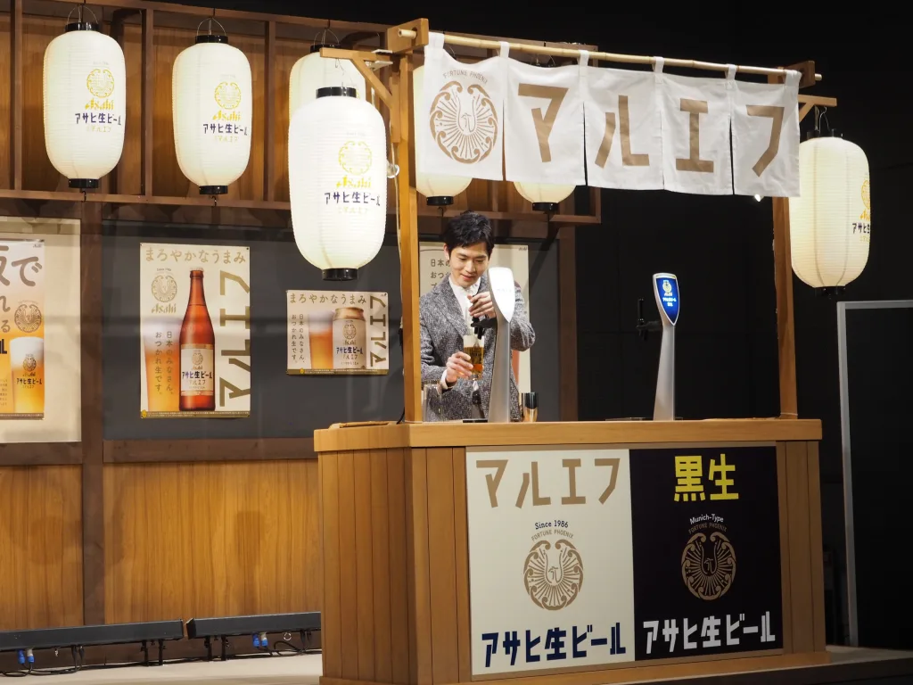 アサヒビールは、阪急梅田駅1階中央WEST広場で「マルエフ横丁 in 大阪」を14日から開催している。期間は19日まで。「アサヒ生ビール」として全国で販売している商品を「通称マルエフ」と呼ぶ。