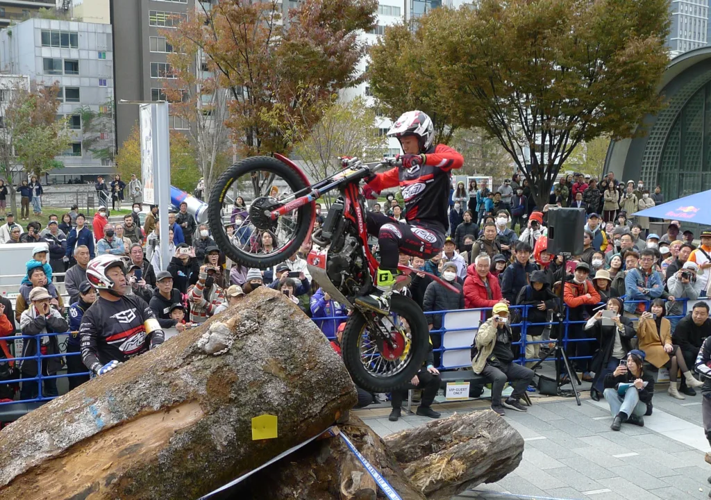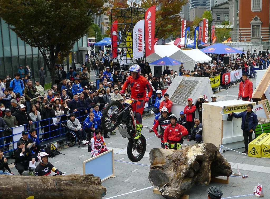 トライアルとは高低差や傾斜が設定されたコースを、オートバイに乗ったまま走り抜けるかを争う競技。通天閣や中之島通りなど街中で開催される同大会は、昨年から全日本のシリーズ戦に組み込まれ、今年はタイトル争いの最終決戦の舞台となった。