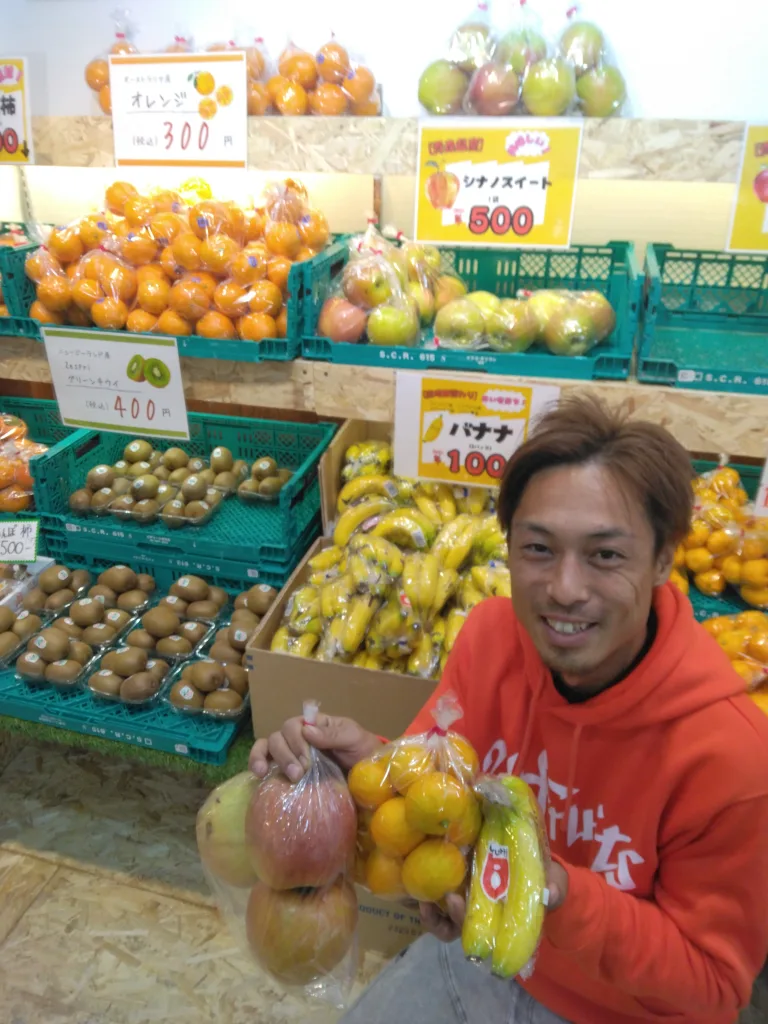 店長の森理彰さんは笑顔で「バナナは赤字の時もあります。でも看板商品なので100円は続けていく!」とコメント。ほかにも近郊でとれたフルーツが市場価格の7割程度の価格でずらりと並んでいる。夜中でも店長自らがフルーツを補充しているが、時間帯によっては売り切れる時もある。