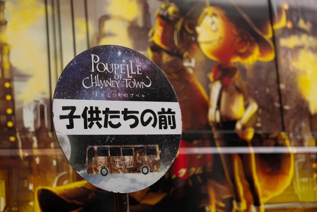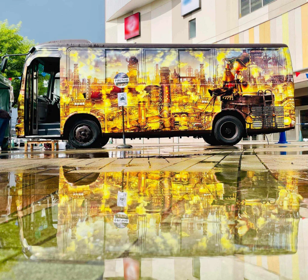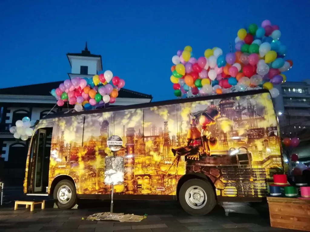 温泉施設の「万博おゆば」の駐車場(吹田市)に12月3日、プペルバスがやってくる。プペルバスは、西野亮廣氏の絵本「えんとつ町のプペル」の光るパネルを車内に展示している移動式の絵本展会場。