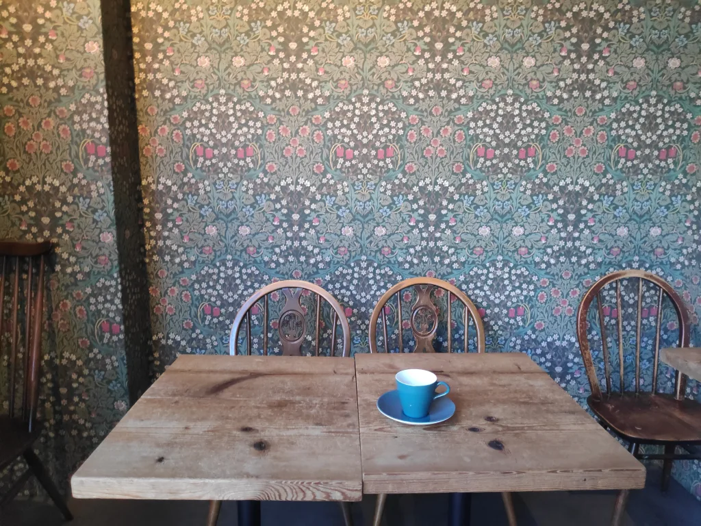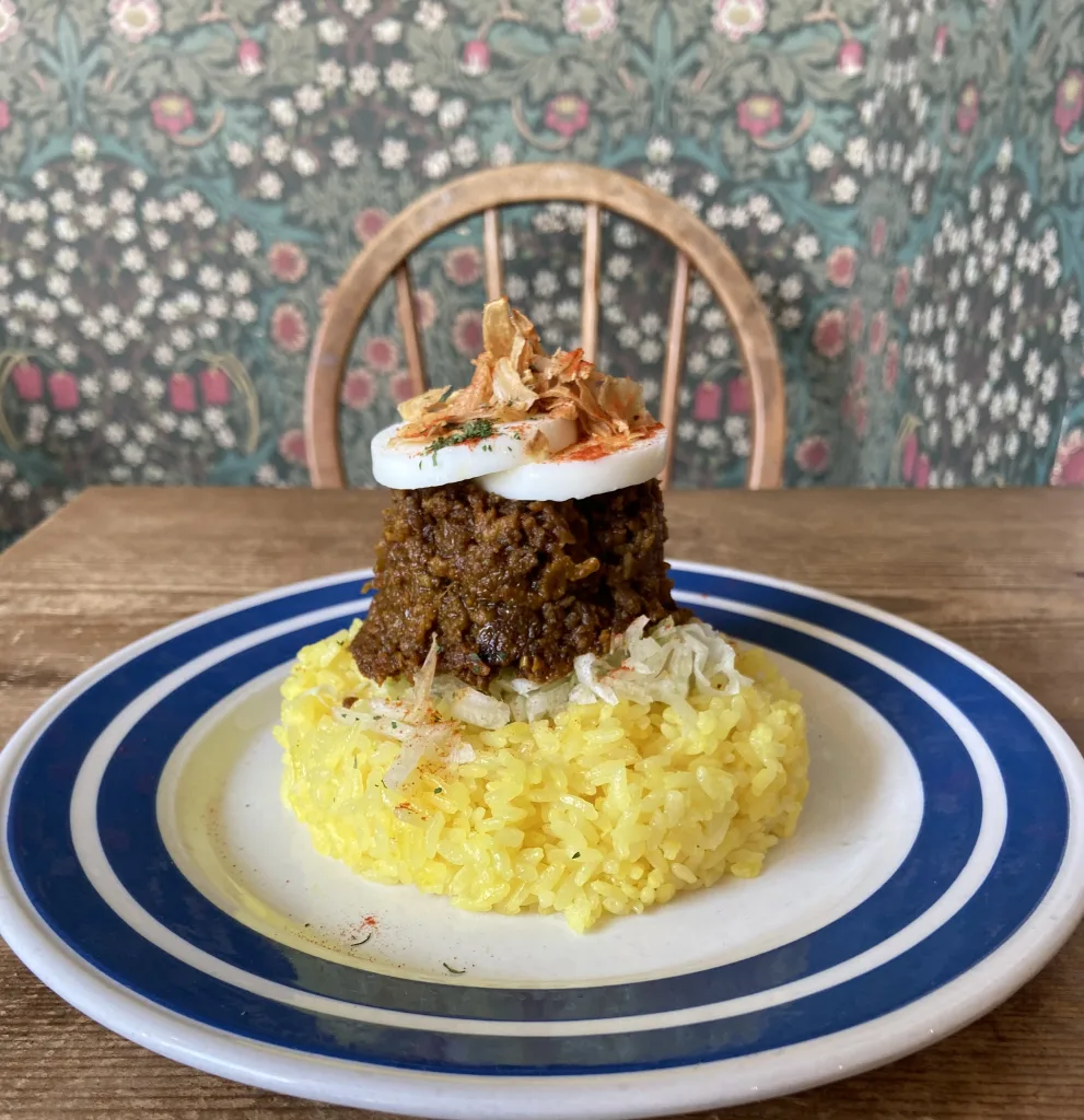 南森町で開店7周年を迎えた「LONG WALK」はジャズを中心にレコードの音楽が聴けるカフェ。英国屈指のデザイナー、ウィリアムモリスの深い緑色の壁紙と年季の入ったユニオンジャック(英国の国旗)が掲げられた店内で味わう玉子トーストやキーマカレーが人気。
