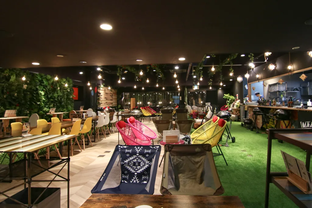 砂浜やテント、芝生で非日常を演出した店内は、立食なら100人、着席なら80人収容できる。砂浜やソファを備えた個室もあるので、企業の大宴会からママ友会の小さなグループまで好評だという。音響設備、プロジェクターを設置しており参加者のコミュニケーションを深めるイベントも可能だ。結婚式の二次会、会社説明会などの催しにもフレキシブルに対応。
