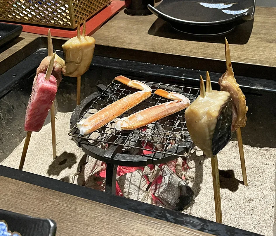 食事には、地産の魚介、野菜など旬の食材を活かした料理を提供。囲炉裏で楽しむ造りにしている。快眠がテーマのため、アルコールを自粛しなければならない旅館かと言えば全くそうではない。ソムリエも常駐し、ワインや地元兵庫の日本酒など豊富にそろえている。週末にはラウンジをバー営業するほどの充実ぶりだ。