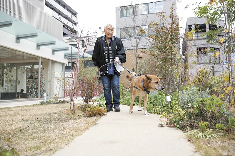 敷地内のガーデンで散歩する入居者と犬