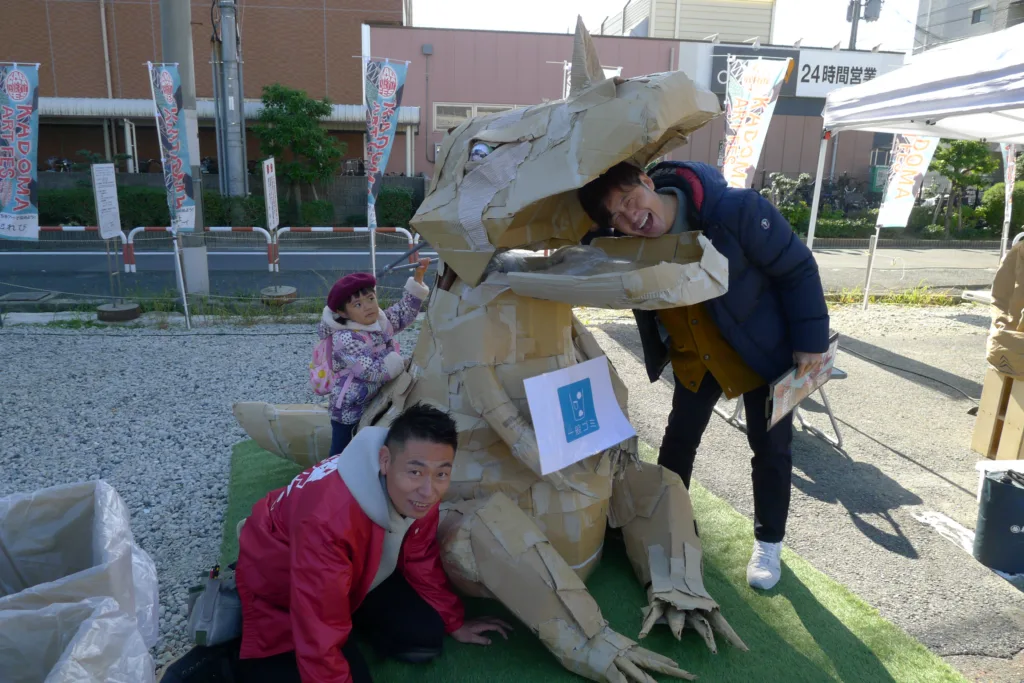口からゴミを入れる巨大な恐竜の形のゴミ箱を出品した長田育紀さん。長田さんはこれまでアートを学んだ経験はないが、自身の子どもに段ボールでおもちゃを作ったりするのが好きで、気軽に触れられるアート作品を出品。ほかにもシュレッダーの紙ごみなど再利用した「エコアニマル」や「太陽の子」など子どもが見て触れて楽しめる作品を出品した。「将来、門真からアーティストが生まれれば最高」と笑顔で語った。