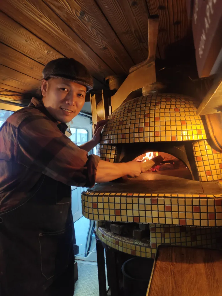 キッチンカーに据えられた窯にクヌギやナラの薪をくべて窯の中の温度を400度超に。高温加熱を短時間にすることで内側の水分がある程度残り、焼き目は香ばしくカリカリに、中はもっちもっちの歯ごたえに仕上がる。同店オーナーの山崎さんは「冷めてもおいしいピッツァの秘密はこれです」と話している。ピッツァのテークアウトもできる。