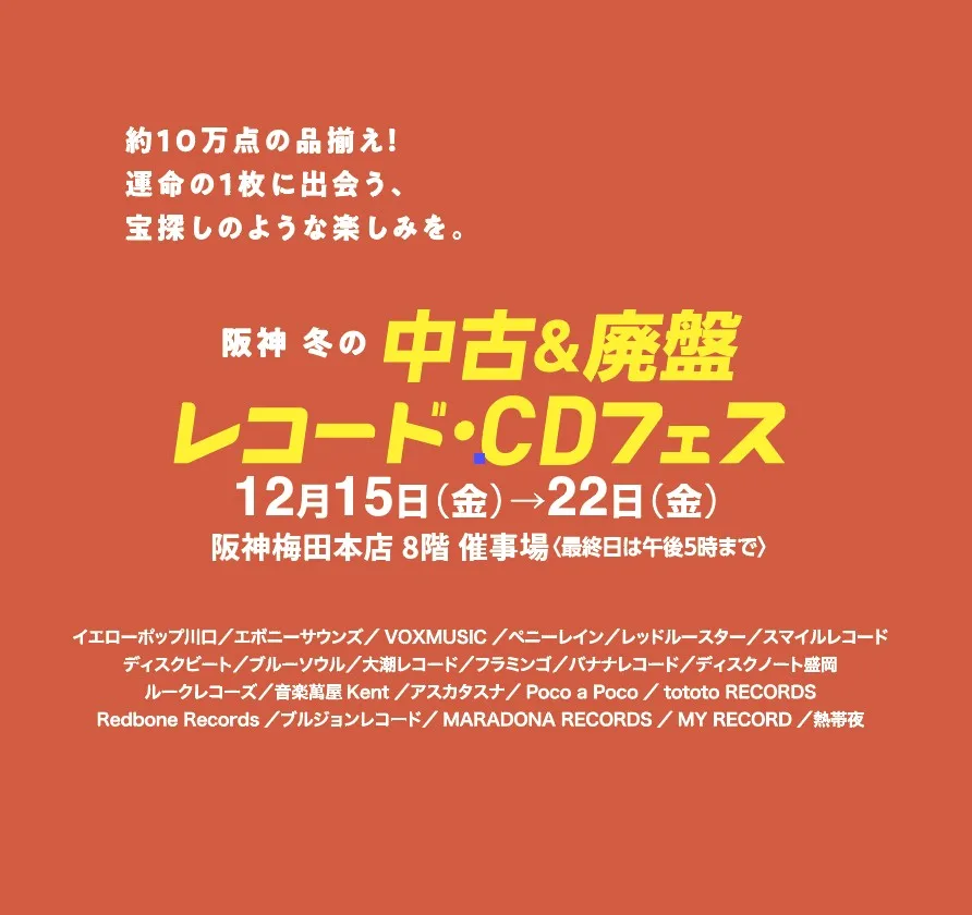 阪神梅田本店の8階催事場で、約10万点以上の品揃えで日本各地のレコードショップが参加するイベント「阪神 冬の中古&廃盤レコード&CDフェス」が12月22日まで開催している。
