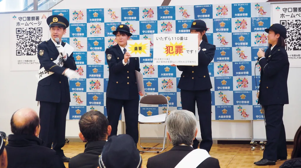 昨年、大阪府内の110番通報は118万3540件。うち24%にあたる28万7412件はイタズラ電話だった説明があると、会場から驚きの声があがった。署員は「イタズラ電話は犯罪。絶対にしないように」と注意を呼びかけた。