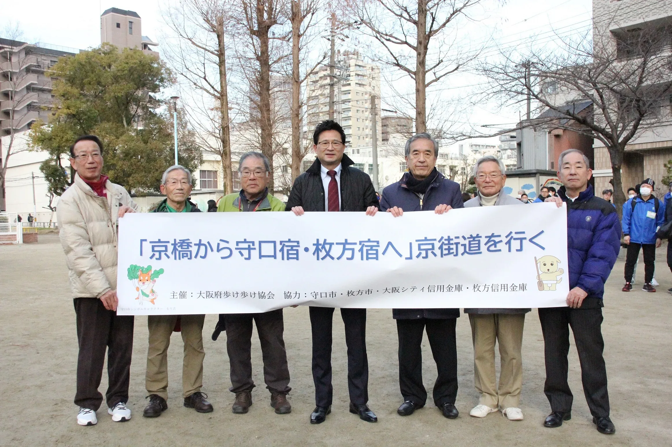1月28日のウォーキングには、瀬野憲一守口市長や高橋知史大阪シティ信用金庫・吉野敬昌枚方信用金庫の各理事長、200人の職員らが参加。大阪シティ信用金庫は、ウォーキングイベントなどを通じ、健康増進や生活習慣病予防のために地域連携を推進し、地域社会の発展に資することを目的に活動を行っている。今回は、大阪側の宿場が、大阪シティ信用金庫本店の「高麗橋」、守口支店の「守口宿」、そして「枚方宿」に枚方信用金庫本店が位置することから共同で参加する運びとなった。参加者は、江戸時代の街道の風情に思いをはせて各コースを歩いた。