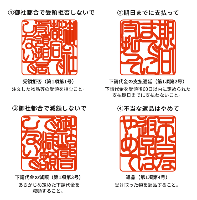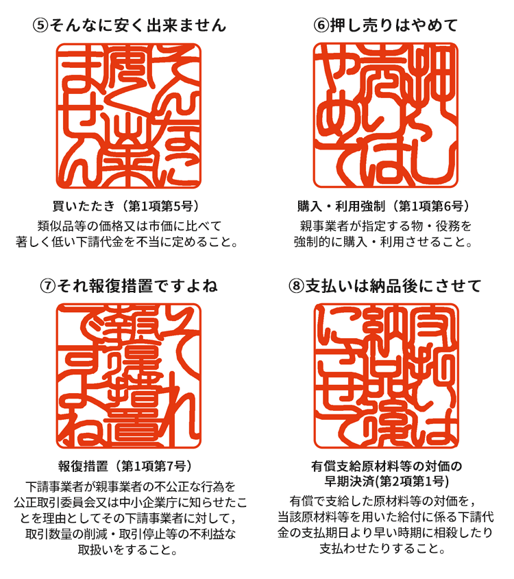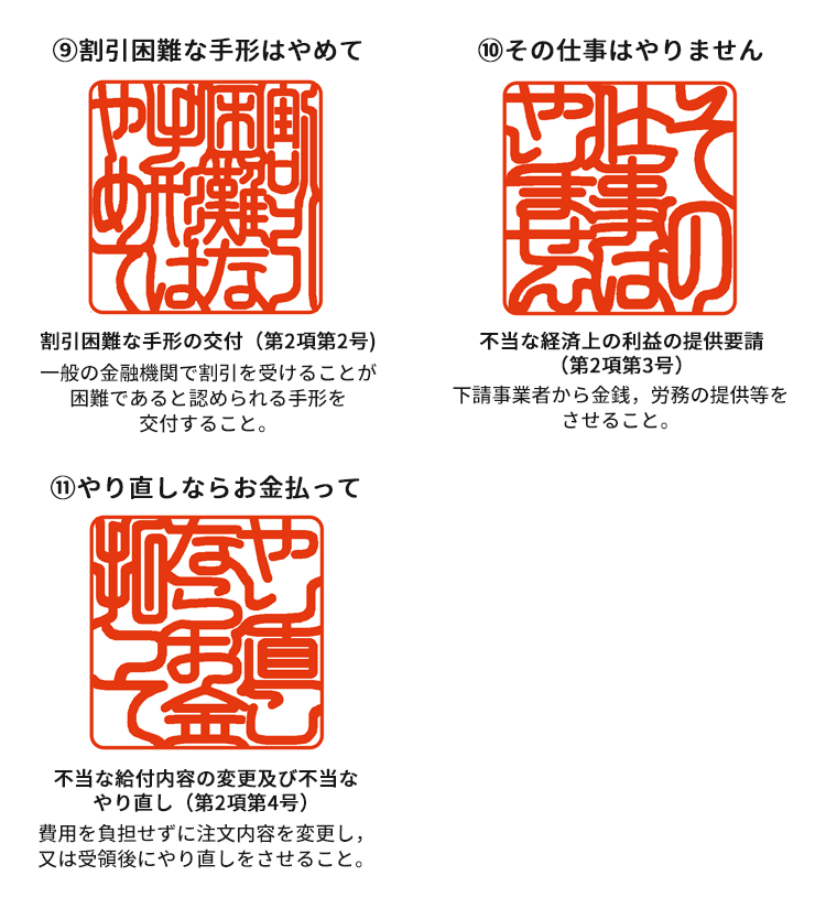 「言いづら印」のデザインは全11種類。下請法で定められている、親事業者の禁止行為11項目に対応した文言から選べる。