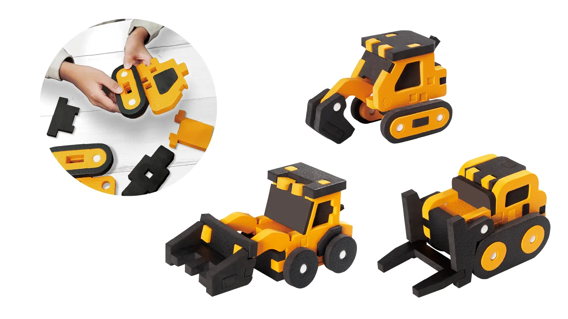 総合雑貨メーカーのハック(東大阪市)はことし3月から順次、やわらか素材の組み立てブロック「やわらかブロック はらたく建設車」、自由に組み立てて遊べる「わくわく!ソフトブロック33P」を新発売する。
