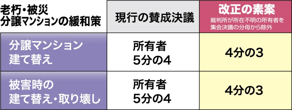 大規模一部滅失、つまり建物の価格の「2分の1」を超える部分がなくなった場合および、全て滅失した建物の建替えや取り壊しに際して、「3分の2」以上の賛成で可決できるよう緩和する。