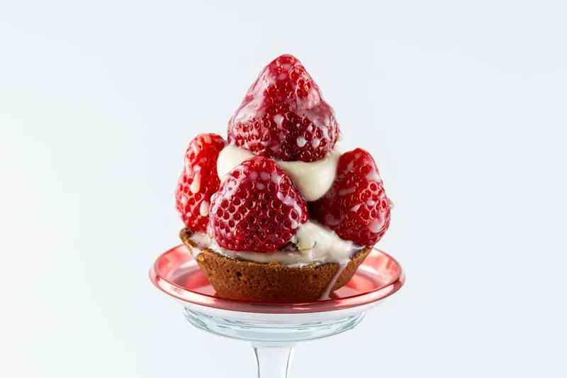 ジューシーで甘酸っぱいあまおう苺をまるごと5個を積み重ねた生いちごのチーズタルト。別添えの練乳をかけて。