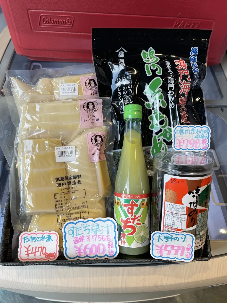 農水産加工品で人気なのが「大野のりの味付け海苔」。週間で100個も売れる隠れ銘品で、同店の売上ナンバーワン商品。地元大阪人のリピーターの多さがトップに押し上げているとのこと。次は、いわずと知れた徳島名産〝わかめ界の横綱〟と呼ばれる「鳴門糸わかめ」。続いて、上位に食い込んでくるのが「たけのこ水煮」。一般的に、国産竹の水煮は高価なものだが、同店の徳島産はリーズナブルな価格で、リピーターが多い。そして最後は、「すだち100%果汁」。ゆずとはまた違う清涼な柑橘(かんきつ)の味わいは徳島人のみならず浪速のプロの料理人からも根強い人気だという。