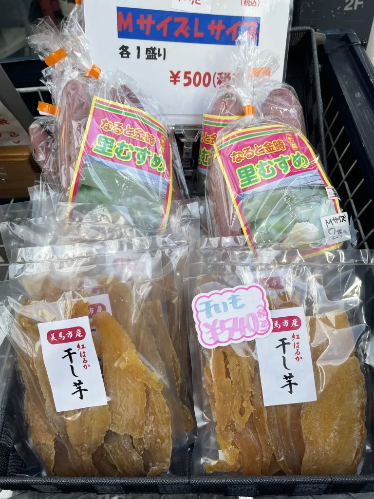 続いて、徳島といえば鳴門のさつまいも。最近の一押しは、鳴門金時の中でも「里むすめ」。ここでは厳選されたイモが徳島から直送される。鮮度がよく価格がリーズナブルだ。スタッフの竹島さんは、「さつまいも原料の食品でおすすめなのが、美馬市産の『紅はるかの干しいも』です。熟成されたいもを丁寧に加工し、しっとりやわらかく、自然な甘さが魅力です」と語る。