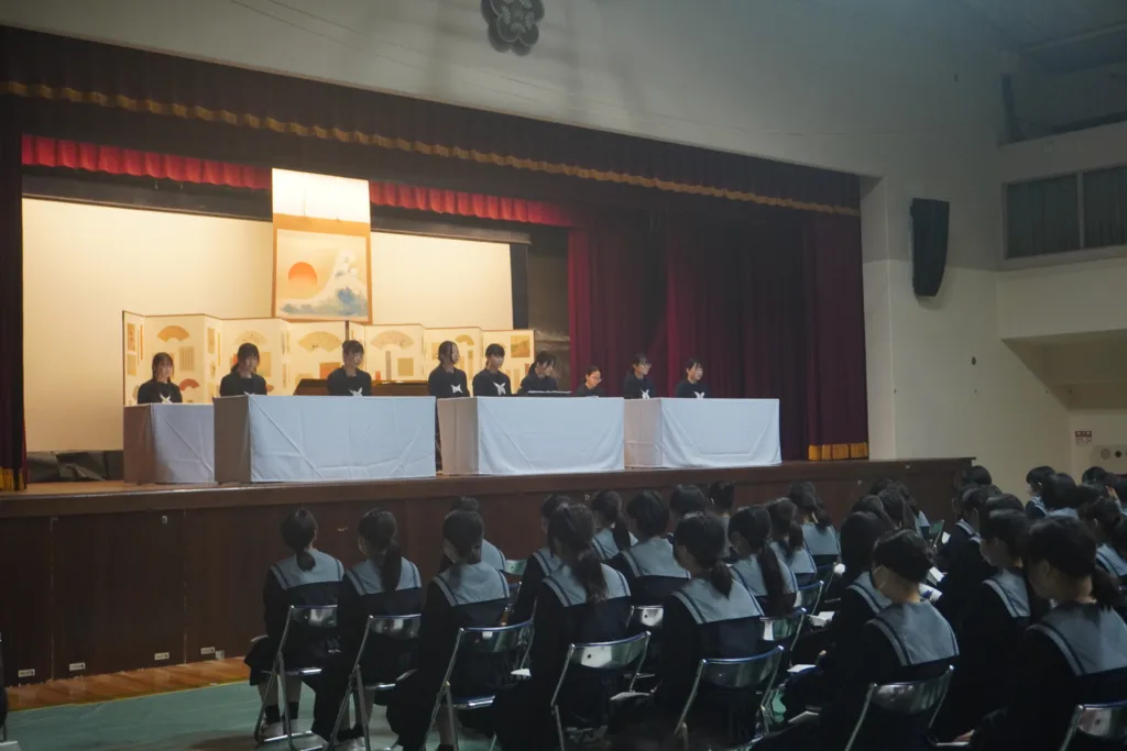 会場となった体育館には1、2年生が参集し、厳かな雰囲気の中、奉仕諸役の生徒11人が各学年の秀歌などを披露した。