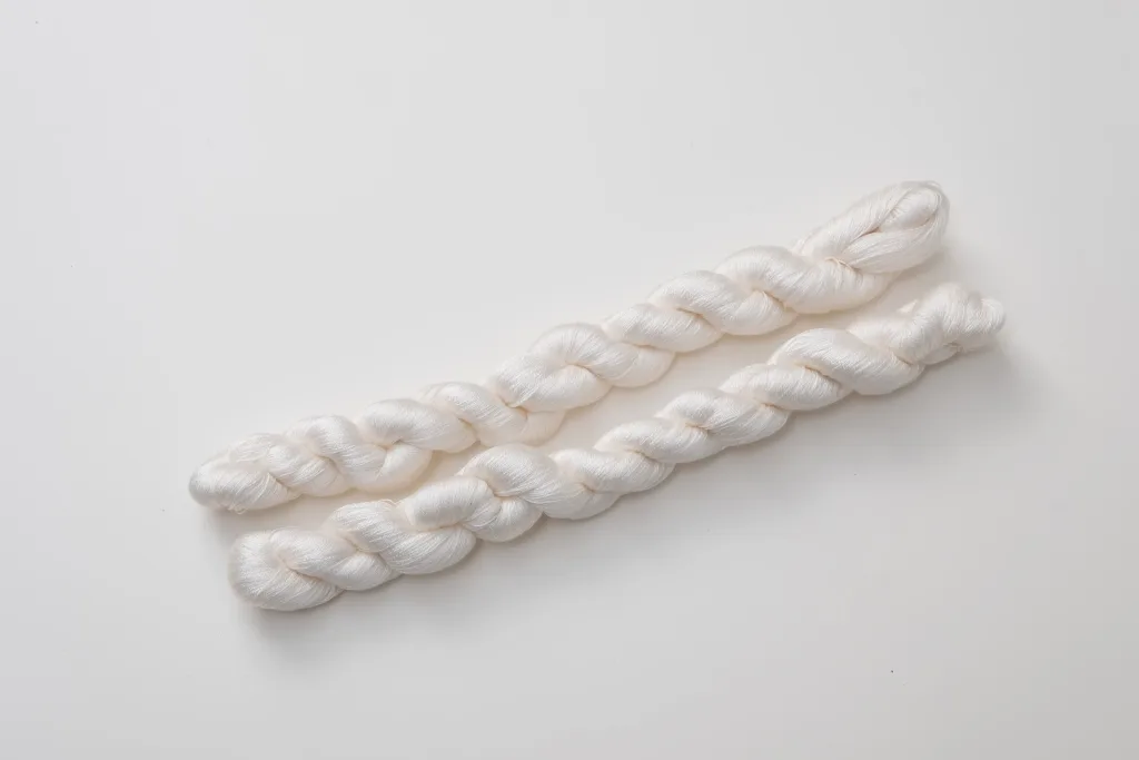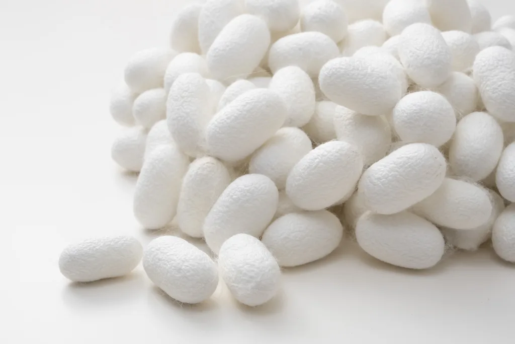 シルクは蚕(かいこ)が体内で作り出すフィブロインというタンパク質の一種が主成分となっている。