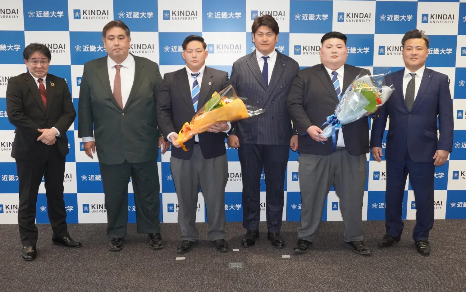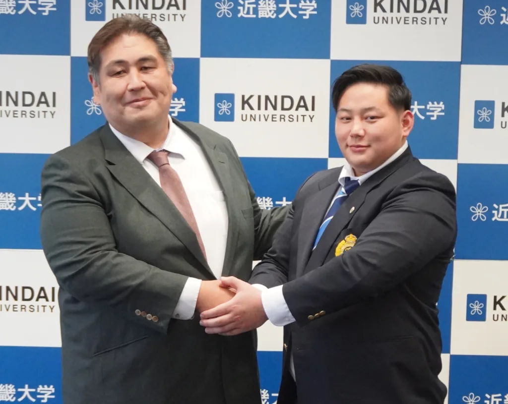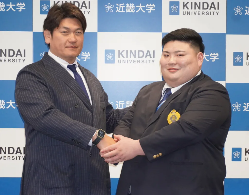 近大は元大関朝潮(元高砂親方)、元横綱旭富士(伊勢ケ浜親方)、元前頭徳勝龍(千田川親方)と、現役で大関経験者の朝乃山と4人の幕内優勝力士を出している名門。2人は「精進して2年以内の関取を目指す」と健闘を誓った。