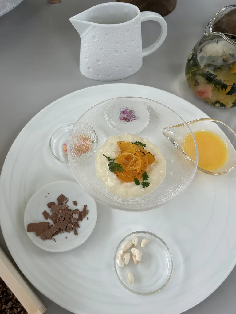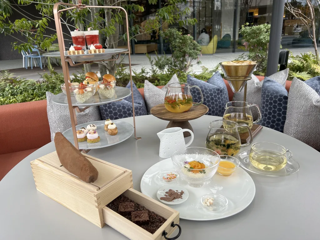 いよいよアフタヌーンティーでお馴染みの3段スタンドが登場。10種類のスイーツやセイボリー(塩味のある食べ物)がかわいらしくセットされている。いずれも、昆布・かつお節のほかにイチゴやスパイス、コーヒー豆などの素材から抽出した「だし」を使用しているというから驚きだ。さすが星野リゾート、どれも手が込んでいる。記者のお気に入りは今年、新たに加わった「リオレのだし茶漬け風」だ。お米をミルクで炊いたリオレに、ミックスジュース味のソースにオレンジやレモンの「だし」を加えたオリジナルソースをかけて食べるなんとも斬新なスイーツ。上にトッピングされているモモやミカンは甘さを引き立たせるために炙っており、周りにある4種類の小皿にはチョコ、あられ、ポン菓子、乾燥したエディブルフラワーと色々な食感や味が楽しめるようになっている。その〝味変〟によって最後まで飽きさせない工夫に繋がっている。