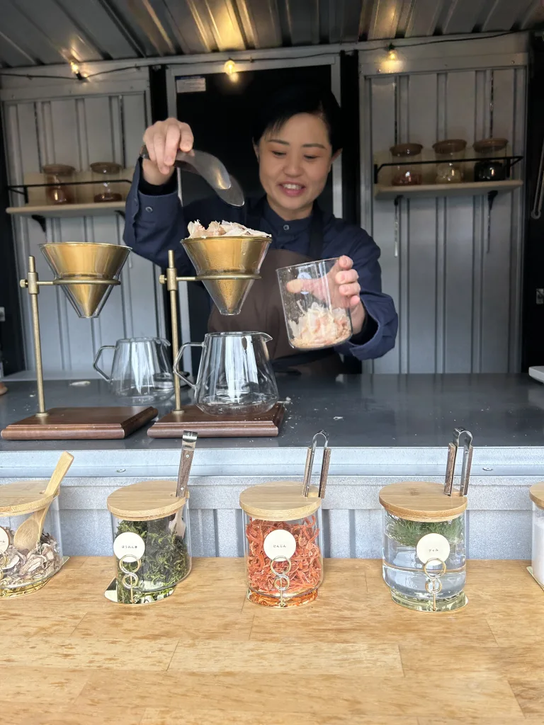 最初に、だしソムリエの資格を取得した同ホテルのスタッフが「だし」ドリンクを用意してくれた。ハンドドリップで、フワフワのかつお節に熱々の昆布だしを注ぎ込む。「だし」をとる姿と良い香りに魅了された。用意された「だし」ドリンクはかつお節+昆布の「スタンダードだし」、スタンダードだし+オレンジ+ほうれん草+マッシュルーム+桜の花びら+タイム+塩の「だしソムリエ特製おだし」、あとは自分で好きな食材を選ぶ「オリジナルだし」の3種類。「だしソムリエ特製おだし」は少し洋風な要素がプラスされスープのような味わい。「だし」だけでこんなにも濃い味が楽しめることに驚いた。