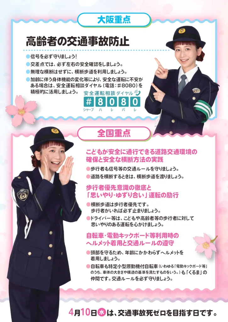 ららぽーと門真で「春の交通安全週間」イベント開催 testtesttest ニチニチ放送局 2024.03.29 商業施設のららぽーと門真(門真市松生町)は4月5日、新生活で外出の機会が増える時期に交通安全の意識を高めようと、「春の全国交通安全運動」啓発イベントを同施設の1階「センターコート」で開催する。開催時間は午後2時~同2時45分。 児童や高齢者向けの交通安全教室のほか、白バイの実物展示や子どもへの制服貸し出しなどを行う。本イベントは、警視庁が4月6日からの10日間、春の交通安全運動を実施し、子どもが安全に通行できる環境の確保などに取り組むというもの。期間中は通学路での全国一斉街頭指導も行われる。
