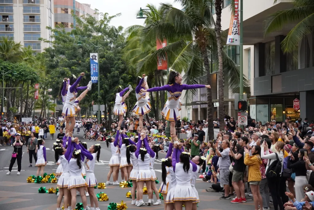 全国大会優勝を競う梅花中学校・高等学校(茨木市)のチアリーディング部「RAIDERS」は3月9、10の両日、ハワイ・ホノルルで開催された「第28回ホノルル フェスティバル」に参加し、ハワイ・コンベンションセンターで演技を披露したほか、カラカウア大通りでのパレードにも出演し、圧巻の演技とパフォーマンスを披露し、現地の観客からは大歓声が沸き起こった。