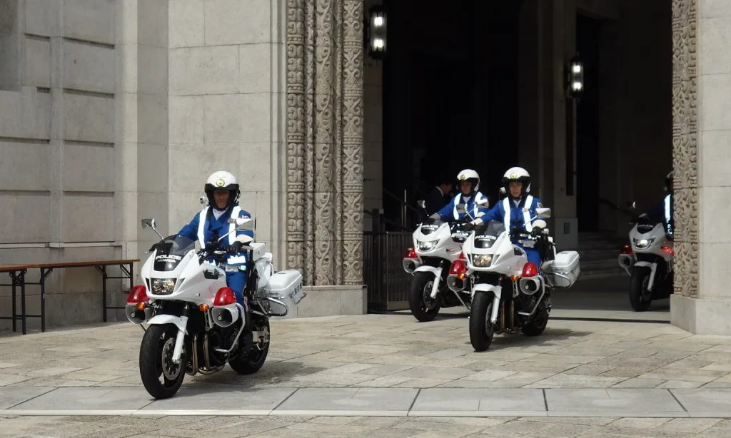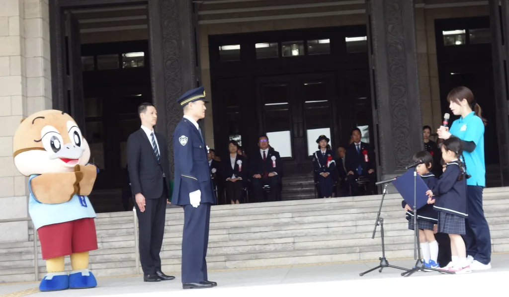 この宣言を受けて向山府警察本部長が府民に向けて「大阪の交通死亡事故と重傷事故の合計が残念ですが、8年連続全国ワースト。自転車でもヘルメットの着用が義務付けられましたが、着用率はわずか5・8%。頭を守ることは大事なことで子どもさんにもヘルメットをかぶってもらい、大人も範を示してほしい。春の交通安全運動が始まりますが、安全の輪を広げていただきたい」と呼びかけた。このあと、園児らが参加して特別ゲストの三戸さんと交通警察官による交通安全教室が開かれた。式典を終え、府警白バイ隊の出発式が行われた。