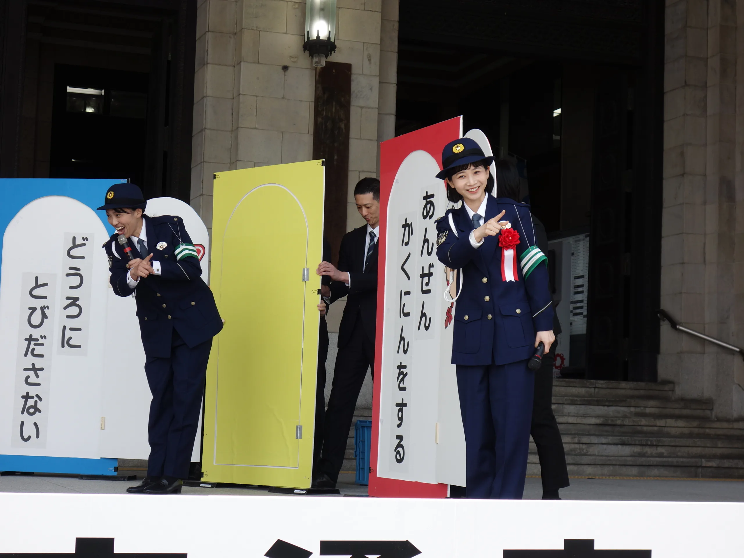 2024年「春の全国交通安全運動」キャンペーン(大阪府交通対策協議会主催)が4月5日、中央区大手前の府庁本館正面玄関前で特別ゲストに同運動の広報啓発モデル、俳優・タレントの三戸なつめさんを招いて開かれ、参加者らは交通事故防止の徹底を図ることを誓った。