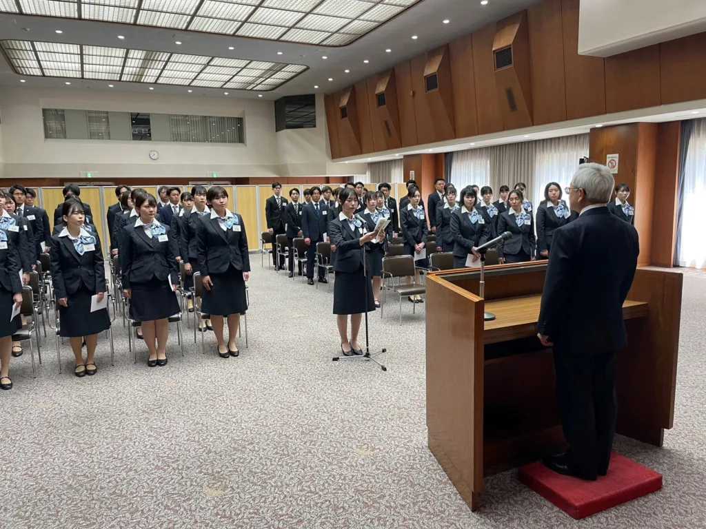 先輩職員として登壇した昨年入庫の吉川樹さんは「地域課題解決に向けて一体となって挑戦し、ともに行動・成長していきましょう」と激励。新入職員を代表して柳智梨さんが「社会人としての自覚を持ち、感謝の気持ちを忘れず、自身の成長と大阪シティ信用金庫の発展のために誠心誠意業務に立ち向かいます」と宣言した。
