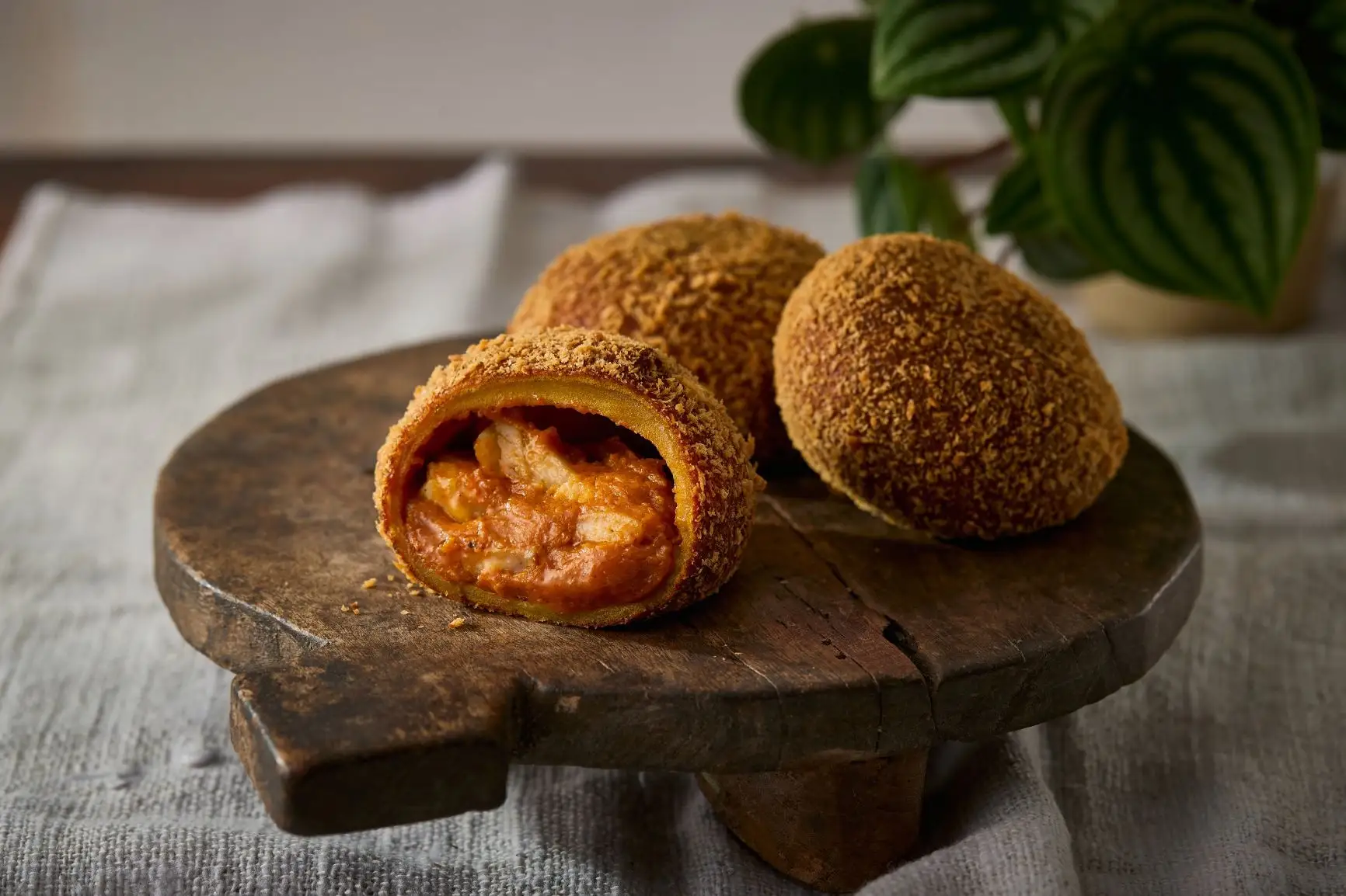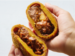 手にとるとずっしりと重みがあるカレーパンは具がたっぷり。ごろっとしたやわらかなチキンとまろやかなバターチキンのおいしさが楽しめる。フィリング(具材)は、トマトやカシューナッツ、バターカレー。生地は、カレーに合わせカレーパウダーを練り込み、さらにタピオカ粉を加えることで表面はサクカリっと、生地はもっちりとした食感だ。