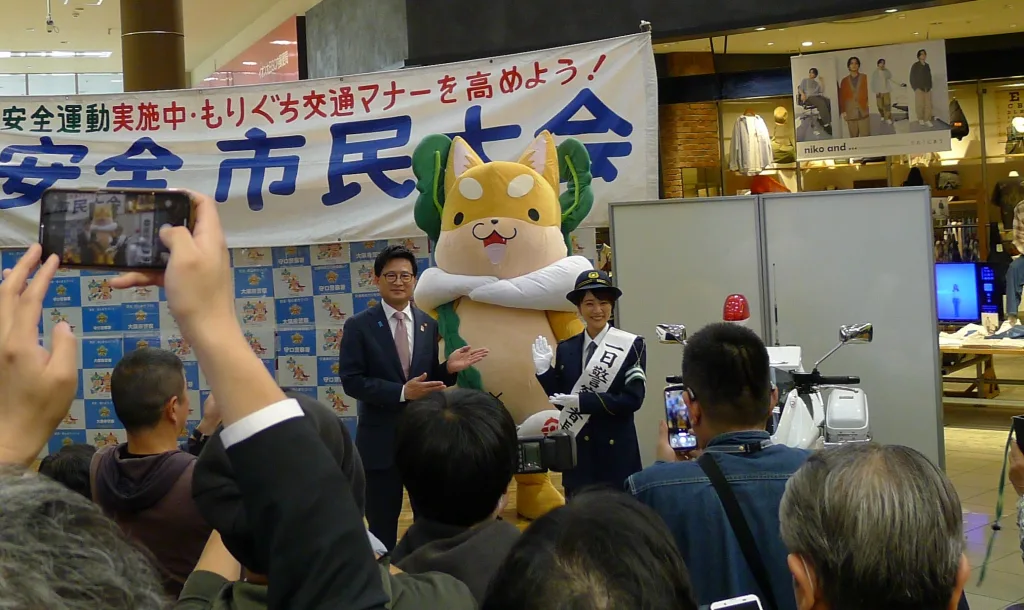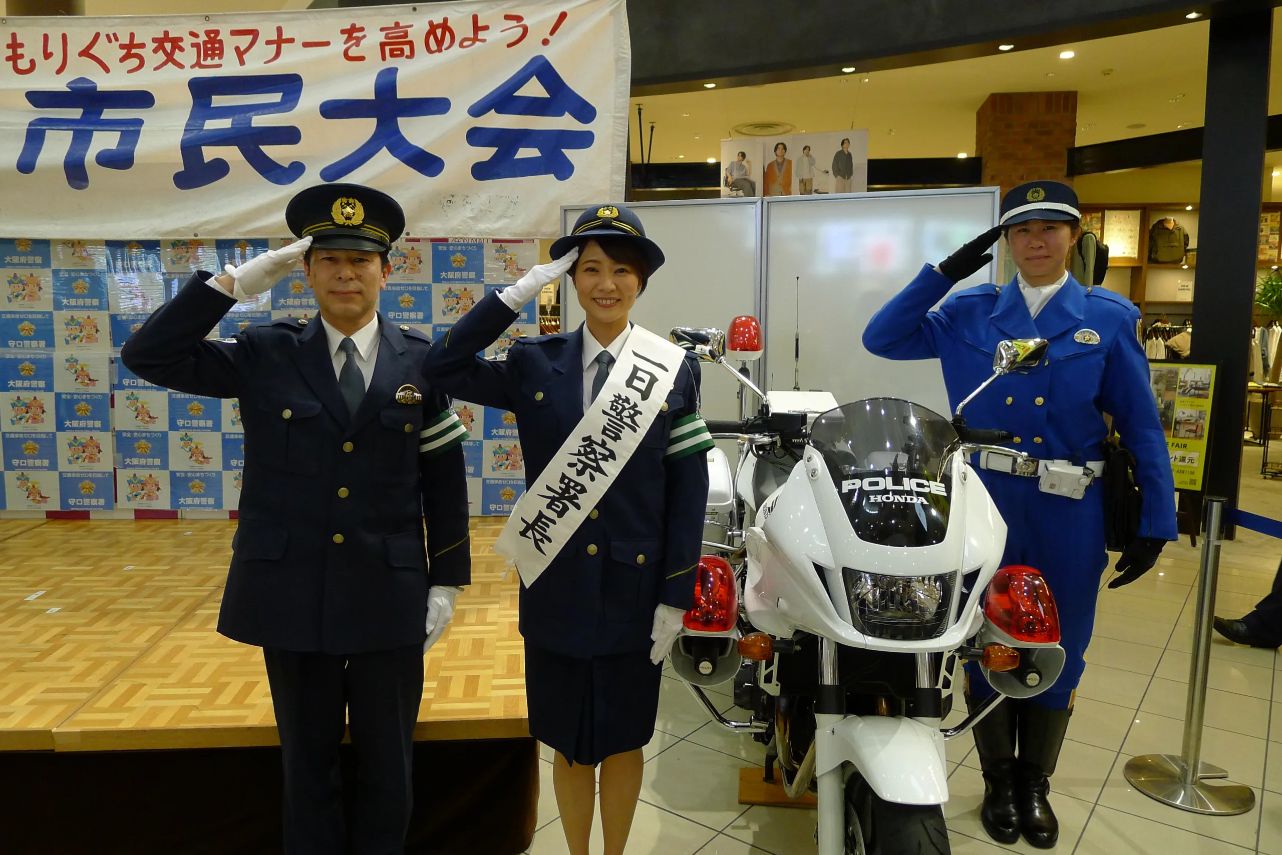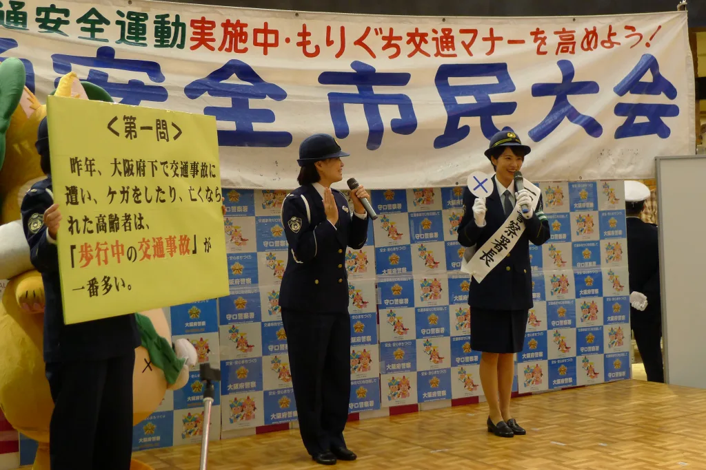 春の全国交通安全運動が始まった6日、守口市のイオンモール大日1階サニーコートで「守口交通安全市民大会」があった。守口署の高島久弘署長から一日署長を委嘱された俳優でタレントの村井美樹さんが登場し、10年間過ごした守口市の思い出話やクイズなど交えて、参加者らと交通ルールなどを学んだ。運動期間は15日まで。
