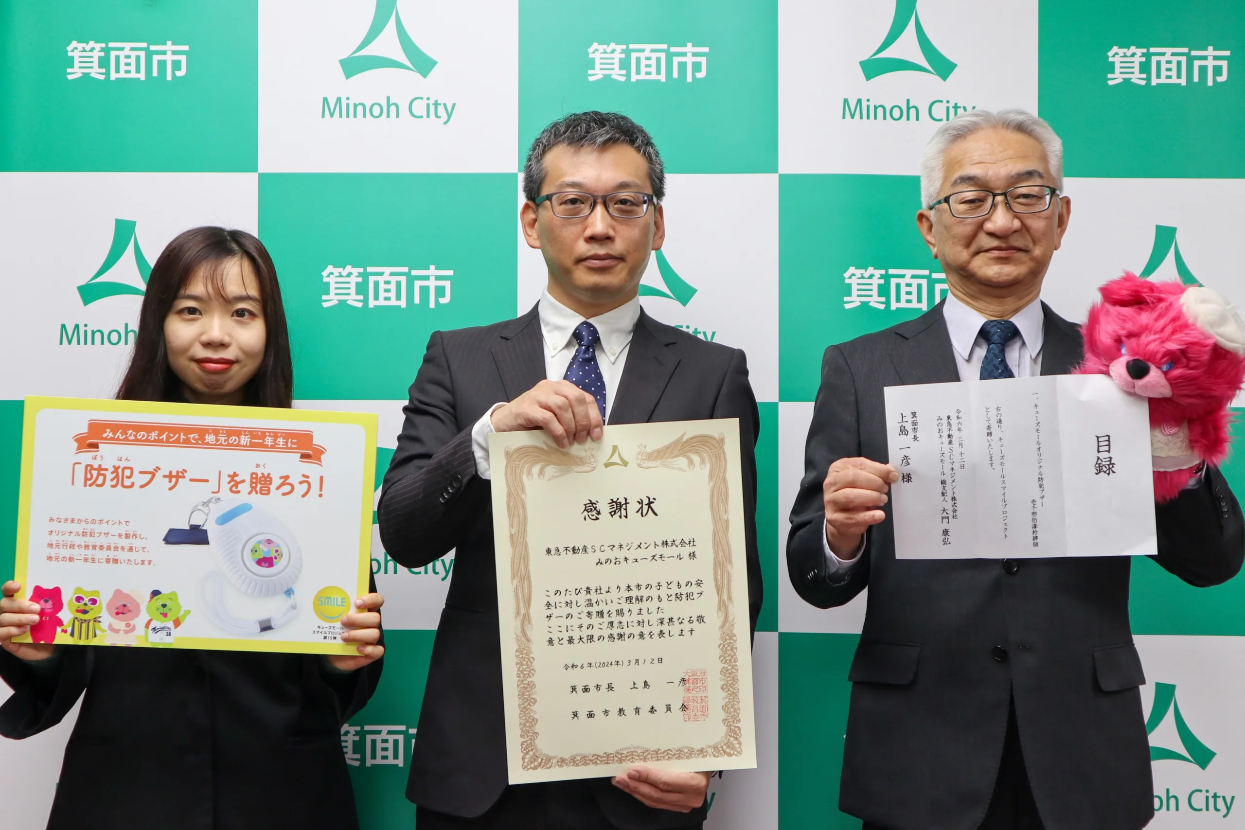 寄付ポイントは合計9万7895ポイントでキューズモール4施設の地元小学校41校へ入学予定の新一年生を対象に、「キューズモールオリジナル防犯ブザー」(3800個)が、キューズモールが所在する大阪市、兵庫県尼崎市、箕面市に寄贈された。