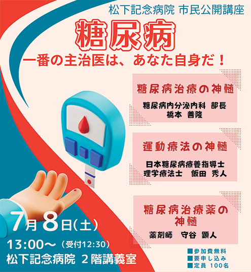 松下記念病院は、7月8日午後1時から「糖尿病」をテーマにした市民公開講座を開催する。手ごわい病だと感じてしまう糖尿病。うまく付き合っていけば、生活の質を落とすことなく過ごすこともできる。まずは病気を正しく理解し、自己管理を始めることが重要。同講座では、「治療」「運動療法」「治療薬」について、各分野の専門家が上手なコントロールのヒントなどを交えてわかりやすく解説する。
