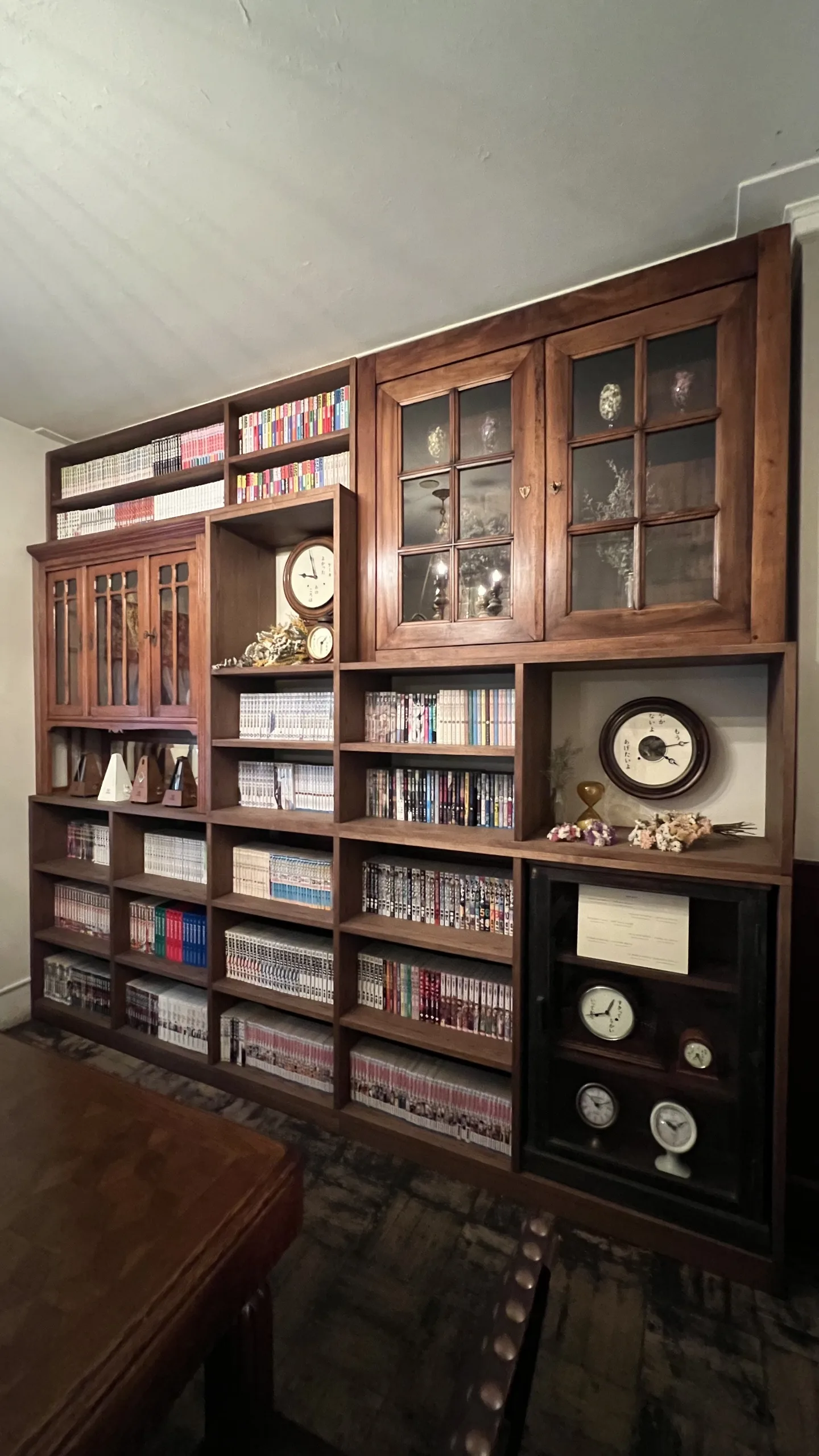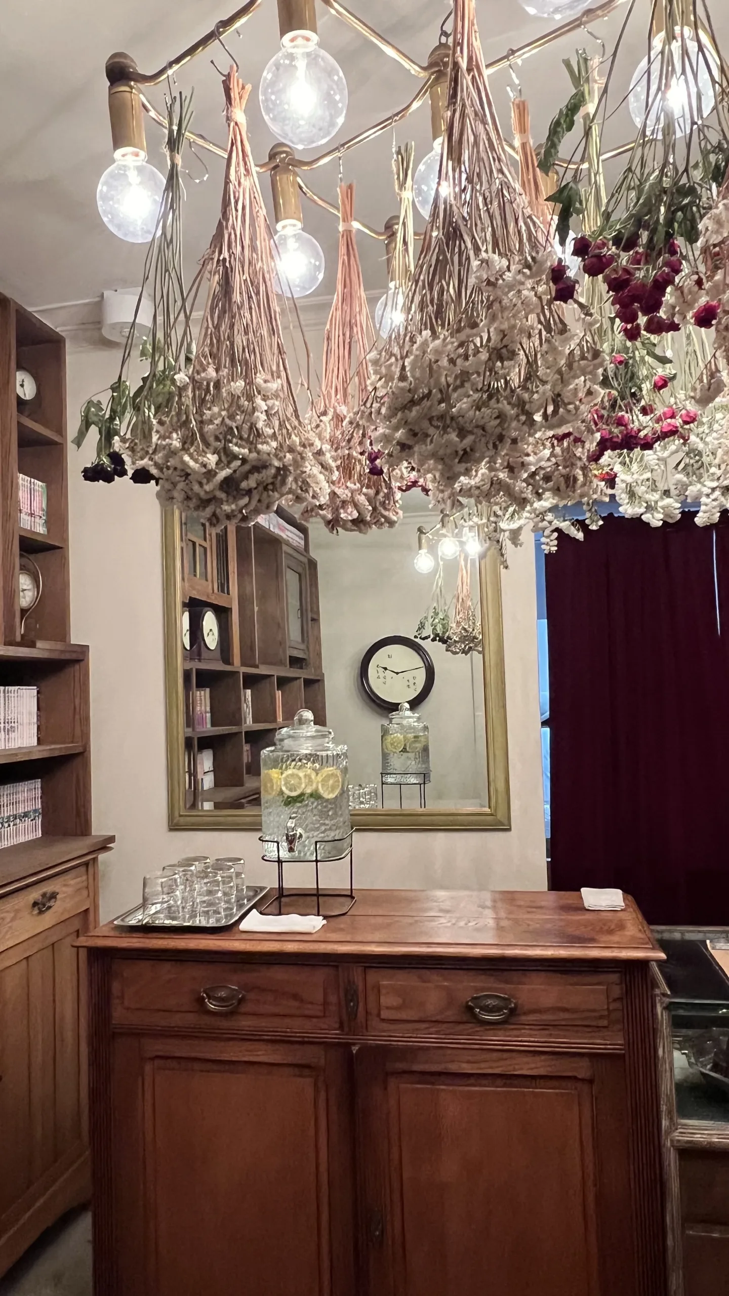 店内に入ると、同店社長発案の謎のメッセージ入りの時計が顧客をお出迎え。本棚にぎっしり備え付けられた懐かしい漫画の数々は社長自身のコレクション。BGMは、アナログレコードを流すこだわりぶり。華やかなドライフラワーでさえインテリアを映えさせる重要なツールだという。早くも店内の異空間さが映えスポットになっている。