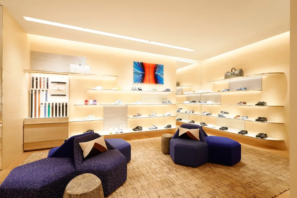 シースルーのファサードから光が差し込み、明るく温もり溢れる空間に進化。バッグを中心に、スモールレザーグッズ、テキスタイル、サングラス、フレグランスが揃う。エントランスから広がるエリアはポップインスペースとなり、期間限定のカプセルコレクションやシーズンコレクションが登場する。