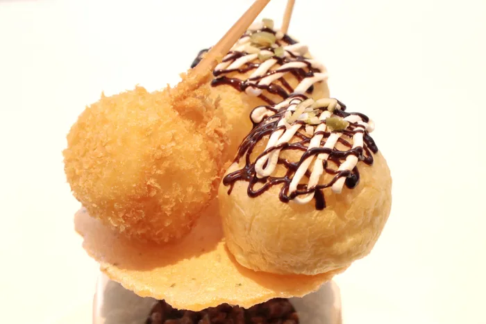 アイスクリームの串カツは、温かみのある外側と冷たい食感のコントラストが楽しめる。使用している素材は、アイスクリームの串カツやプチシューアイス、えびせん、ストロベリーソース、コーンフレーク、ホイップクリーム、パウンドケーキ、フルーツ、カクテル、チョコクリスピー。SNS映えする大阪名物のたこ焼きと串カツのスイーツを片手に観光地を巡ってみては。