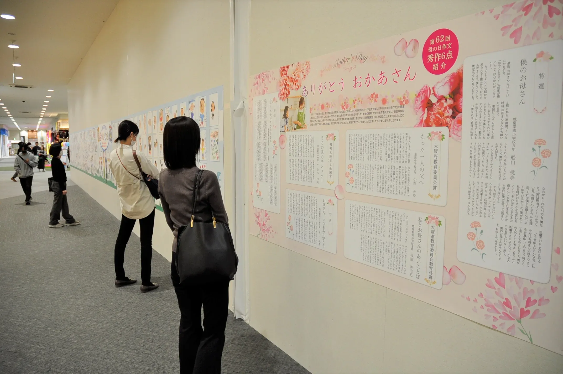 守口市大日東町のイオンモール大日で5月12日(母の日)まで、小中学生が母の日をテーマに綴った「母の日作文」を同所イオン棟3階のペット専門店「ペテモ」前に展示している。作文は週刊大阪日日新聞が毎年、紙面で実施している企画で、秀作6点を縦約1・2㍍、横約2・4㍍のポスターサイズに拡大して掲示した。