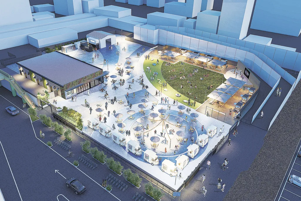 「イオン京橋店」跡地に再開発までの暫定利用で、イベント広場やフードホールなどを設けた屋外施設がオープン。スポーツやエンターテインメントの観戦・観覧の他、飲食屋台やキッチンカーもあり、人工芝でくつろぎながら飲食できるのも楽しい。