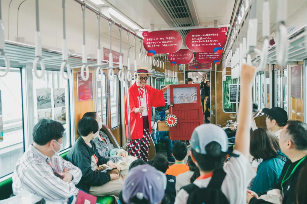 舞台の監修は、京都を拠点に活動する劇団・ヨーロッパ企画の左子光晴さん。大阪万博が開催された1970年代の雰囲気から、大阪・関西万博を控える2025年現在、大阪・関西万博で描かれる未来の世界観まで、「過去・現在・未来」をテーマにした体験型演劇が車内で繰り広げられた。