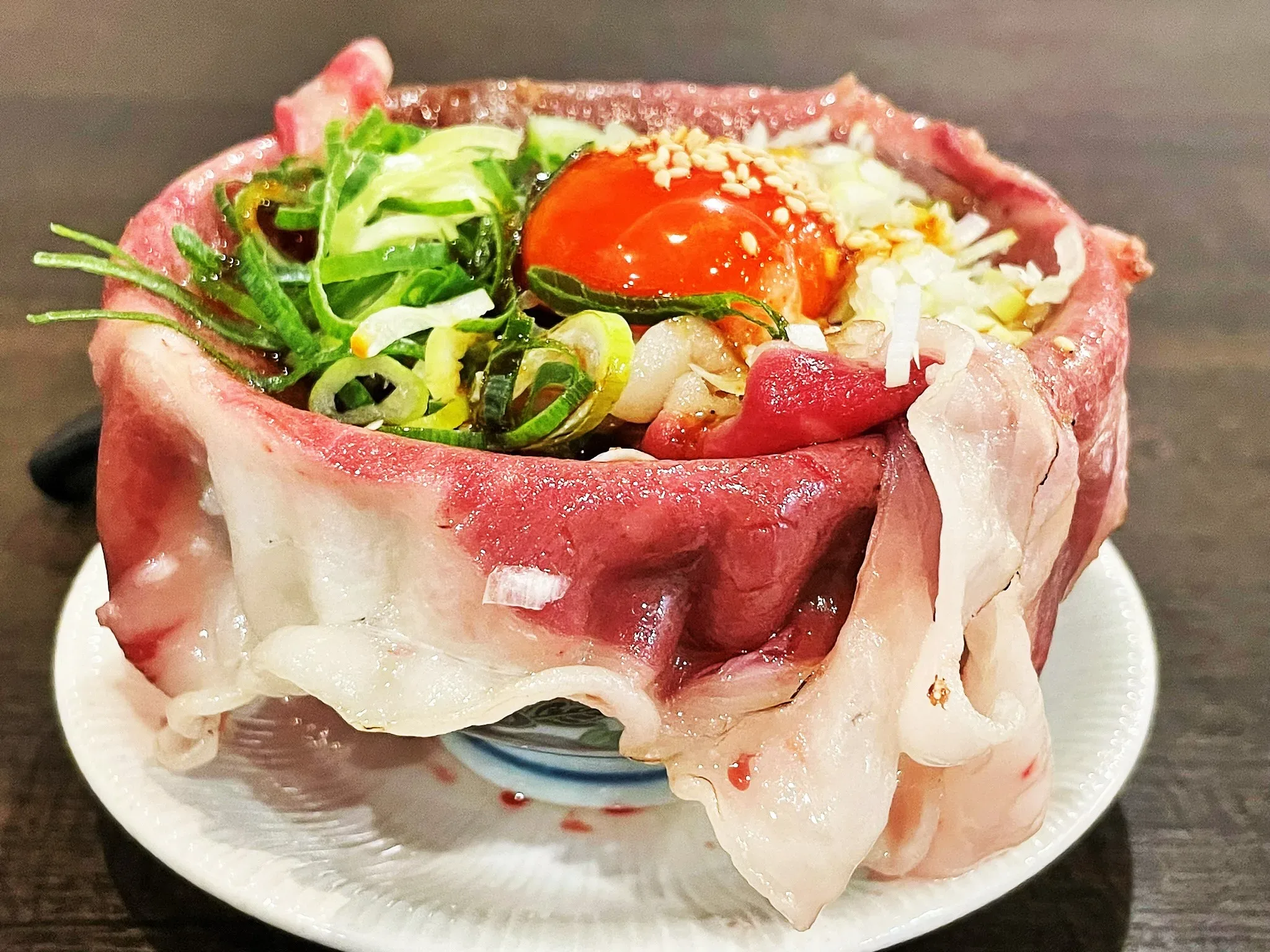 そんな同店は知る人ぞ知る隠れメニューがある。主役である焼肉の陰に隠れひっそりとメニューに載っている「国産牛サーロインユッケ丼」だ。「お肉倍盛り」で注文すれば、スライスされた国産牛サーロインが器を包み込んだ豪快な丼がやってくる。米は羽釜焚きの魚沼産コシヒカリ、濃厚卵は「ええ卵」を使用、たっぷりネギにユッケだれがしっかりかかっている。価格は普通サイズで878円、「お肉倍盛り」は1,428円。