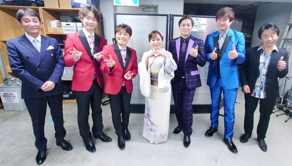 大阪発流行歌ライブ終了後、他の出演者と共に記念写真に収まるはやぶさ(左から2,3人目)