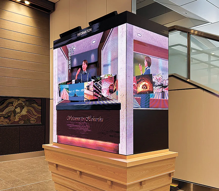 その一つが乗客全員が乗降する敦賀駅への大型LEDビジョンの設置だ。高さ幅ともに2㍍のディスプレイは側面も映像を映し出せる3面式になっており、「JRと北陸3県と協力して、北陸の食や観光情報などを流すことで旅への期待感を高めている」(林課長)