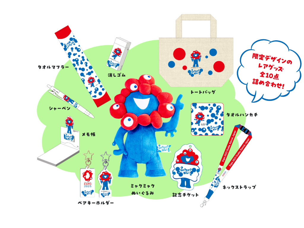 「中人」「小人」の入場チケットで当選した人には、ミャクミャクのぬいぐるみや特別記念チケットが含まれる「ミャクミャクぽん!」限定デザイン万博グッズ詰め合わせ(すべて非売品)がプレゼントされる。