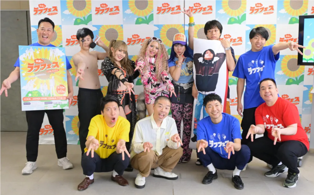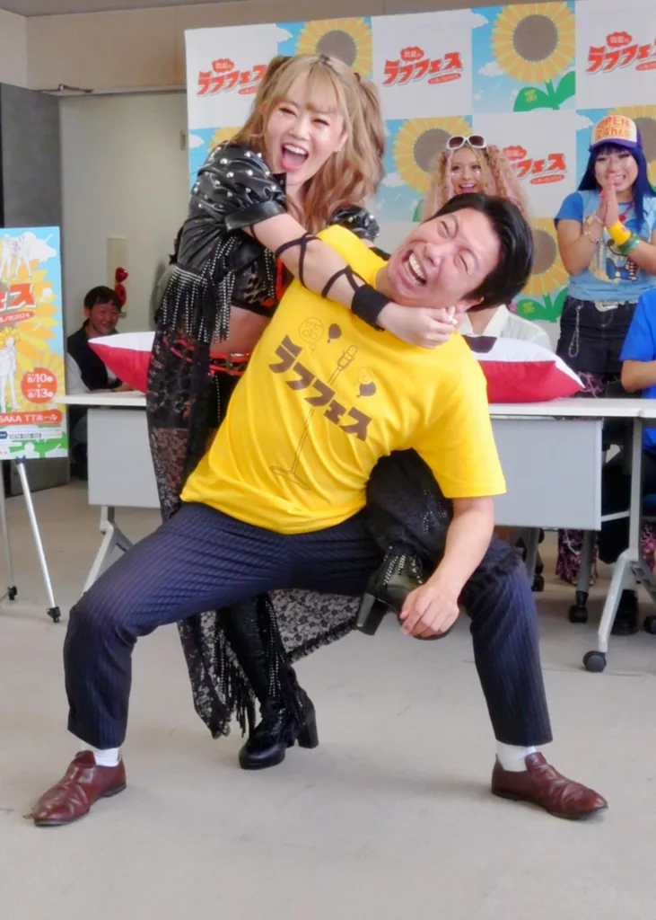 お盆休み恒例の「真夏のラフフェスin森ノ宮2024」(8月10~13日、大阪城内・JR森ノ宮駅徒歩5分、COOL JAPAN PARK OSAKA TTホール)概要発表会見にお笑いコンビ「アキナ」「藤崎マーケット」「フースーヤ」と「スーパーマラドーナ」武智、「ミルクボーイ」内海が登場。東京からギャルモデル〝うさたにパイセン〟こと岩本紗也加、女子プロレスラー小橋マリカ、プリプリマルチクリエイターのリリースペイシーも参加。報道陣も含め終始笑いが絶えない展開に、ギャルの方が「ホェ~大阪の記者会見ってこんなに皆で笑うんだ!」とびっくり。