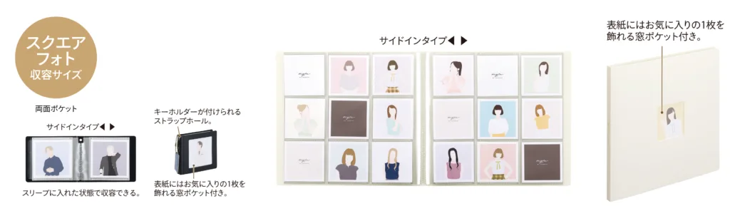 推しグッズの定番である写真グッズをスリーブに入れた状態で収容できる「フォトコレクションファイル」。しっかり収容量できるタイプと、携帯しやすいミニタイプの2タイプ。表紙にはお気に入りの1枚を飾れる窓ポケット付き。写真が抜け落ちにくいような仕掛けも。
