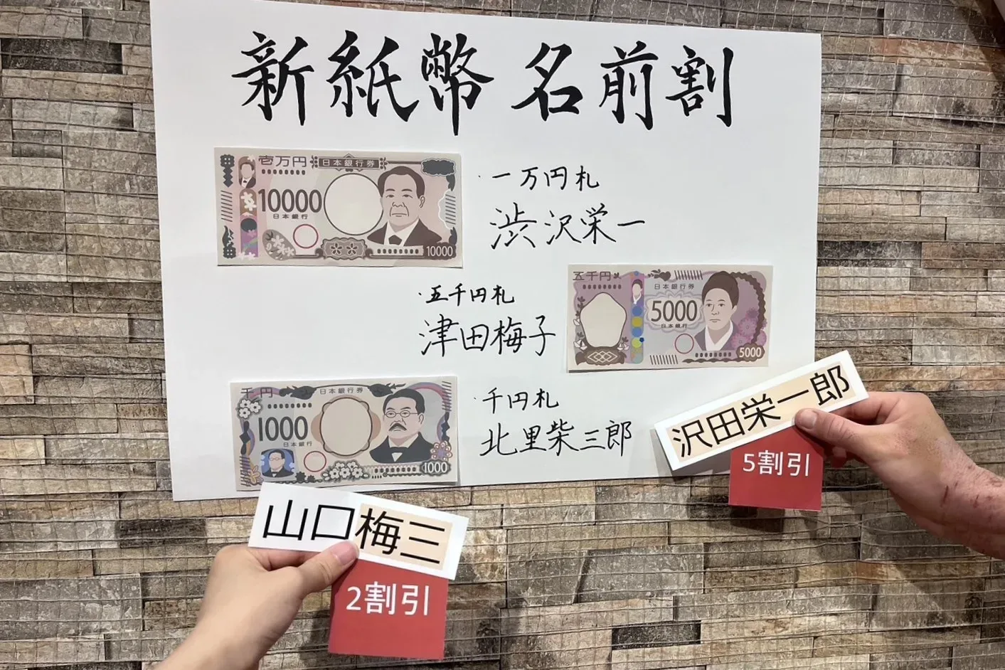 「渋沢栄一」「津田梅子」「北里柴三郎」の中で、一致する名前の漢字の数に応じて一文字につき1割、最大5割を食事代から割り引く。例えば、山本花子なら「子」で1割引、山口梅三なら「梅」「三」で2割引、沢田栄一郎なら「沢」「田」「栄」「一」「郎」で5割引になる。グループの場合は、割り引き率が最も高い人を適用する。来店の際は運転免許証や保険証など、名前が確認できる身分証の提示が必要になるのでお忘れなく。
