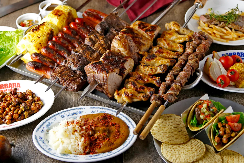 夏期限定の特別プランでは肉など、ブラジル生まれの肉料理「シュラスコ」各種に加え、サラダや包んで楽しいトルティーヤ(薄焼きパン)、さらにはスパイスカレーなども食べ放題。