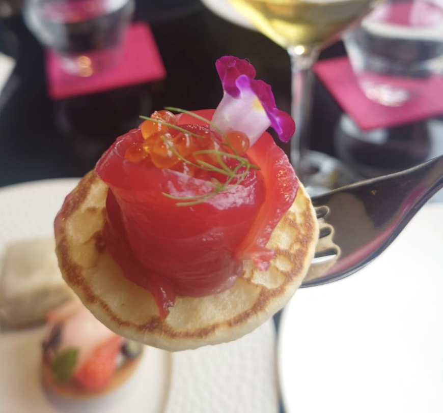 セイボリーのおすすめは「ブリ二とフォション風サーモンマリネ」。フォション・パリのレシピに倣(なら)い、ビーツでフォションピンクに色付けしたオレンジの香り漂うサーモン上に、紫色のエディブルフラワーをあしらえた艶やかな色彩がまぶしい一品。