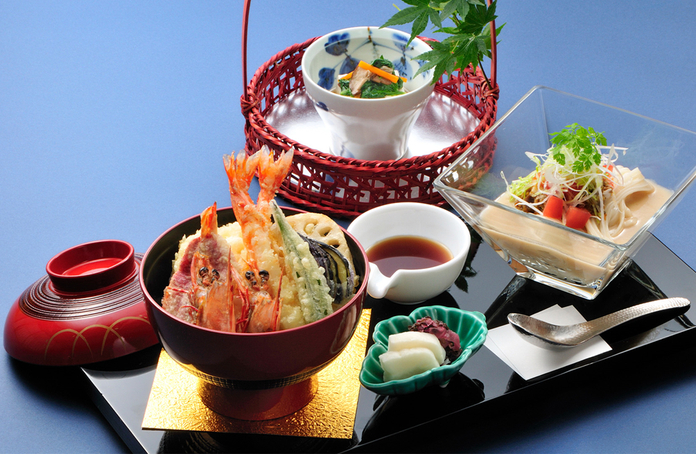 和歌山県産 天然の「足赤海老」、鱧(ハモ)に新蓮根など夏が旬の食材を使用。サクサクとした食感と上品な盛り付けをそのまま楽しめるようにと、つけてもかけても楽しめるタレを別添えにした提供スタイルもこだわりの一つ。