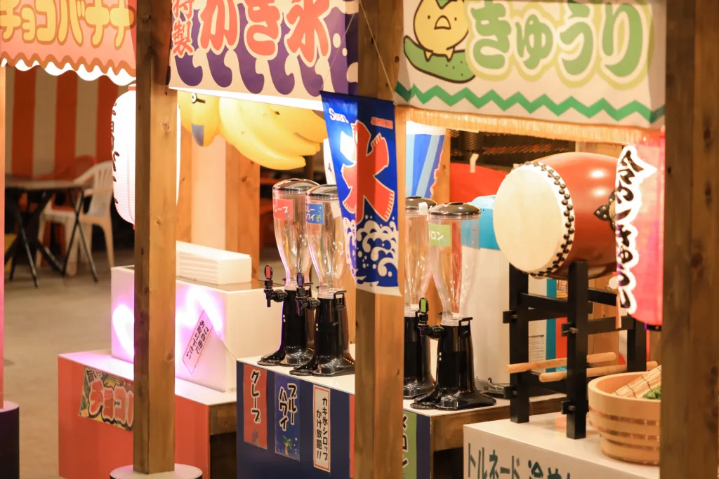 今回の目玉は「屋台ビュッフェ」で、祭りの定番焼きそばやフランクフルト、唐揚げのほか、かき氷やチョコバナナなどデザートも食べ放題。BBQの肉は黒毛和牛と味にもこだわる。
